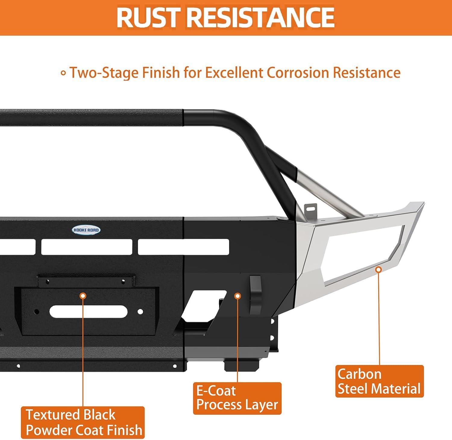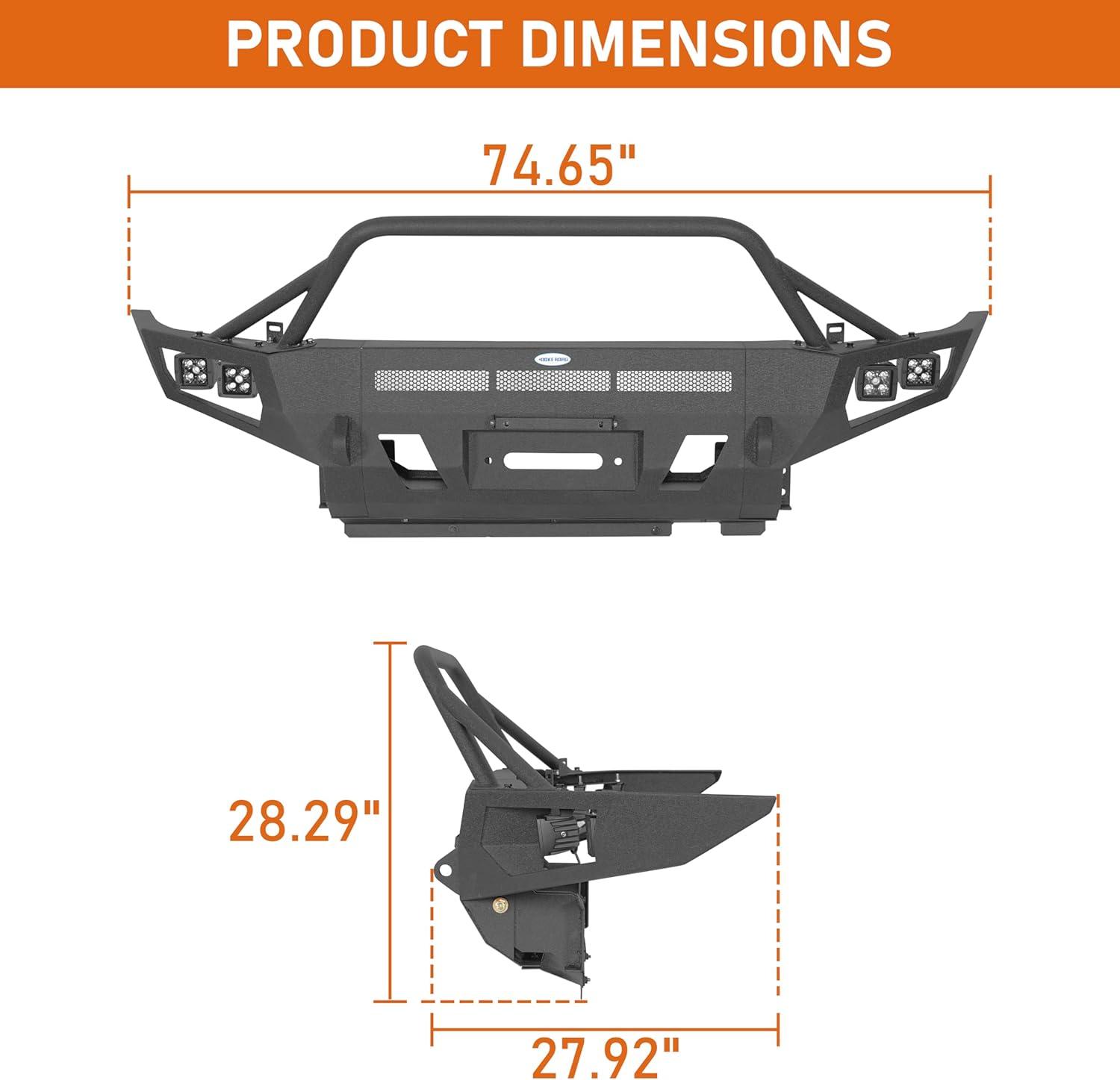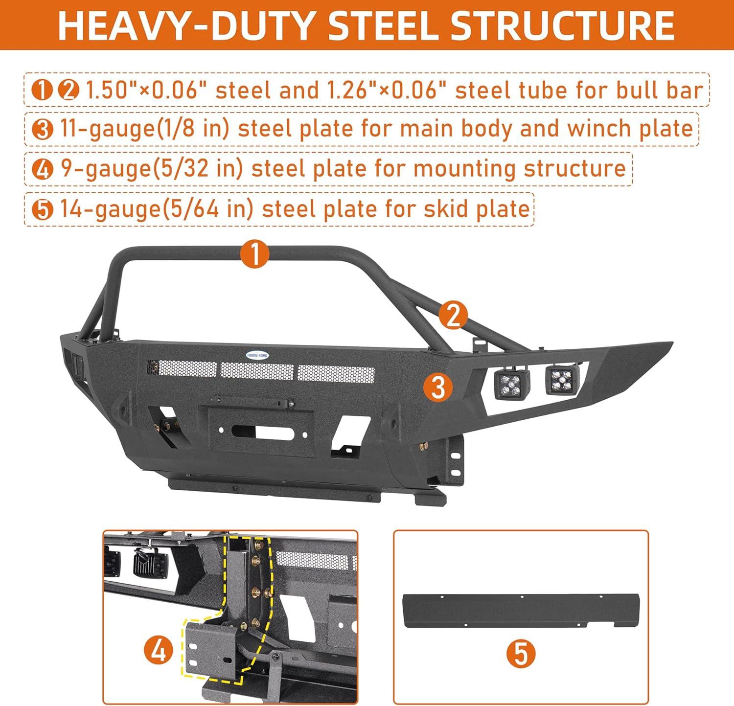 【Heavy Duty Construction】- Heavy-duty, high tensile 11-gauge (1/8 in) steel for bumper main body, 1.50″×0.06″ and 1.26″×0.06″ steel tube for bull bar, 9-gauge(5/32 in) steel plate for mounting structure—while maintaining a manageable weight of 100 lbs, with less impact on the vehicle's performance