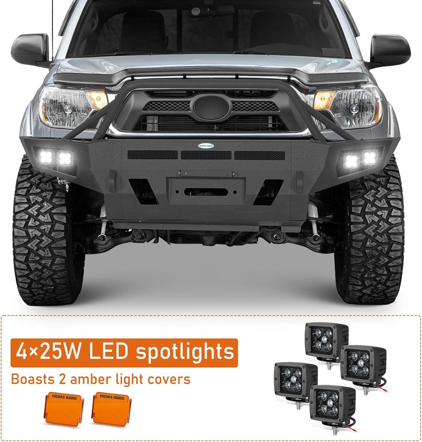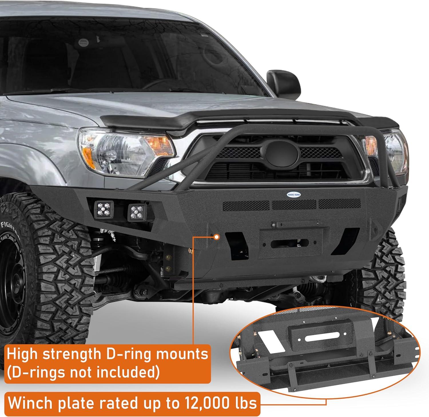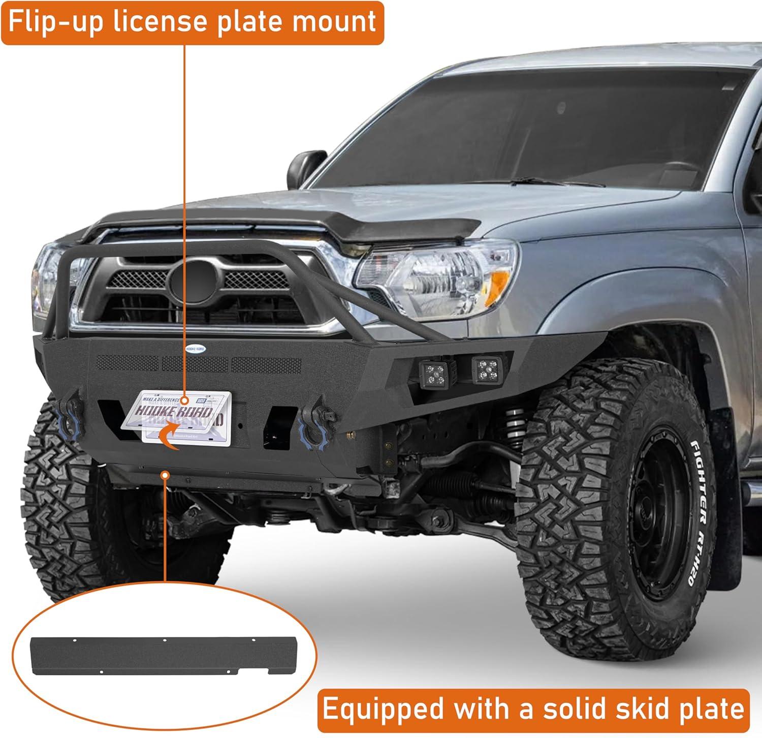 Hooke Road 12-15 Tacoma Full Width Front Bumper w/Tube Grille Guard for 2012-2015 Toyota Tacoma 2nd Gen, Sturdy Steel Offroad Bumper with Winch Plate, LED Lights, D-ring Mounts