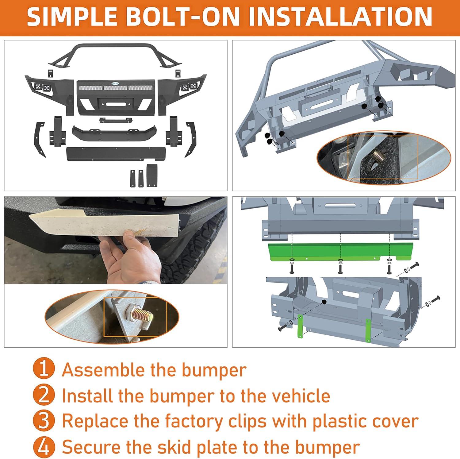 【Enhanced Off-road Protection】- This full width bumper combines aggressive style with superior strength. Includes a full bull bar and solid skid plate for comprehensive front-end protection against brush, rocks, and other trail debris