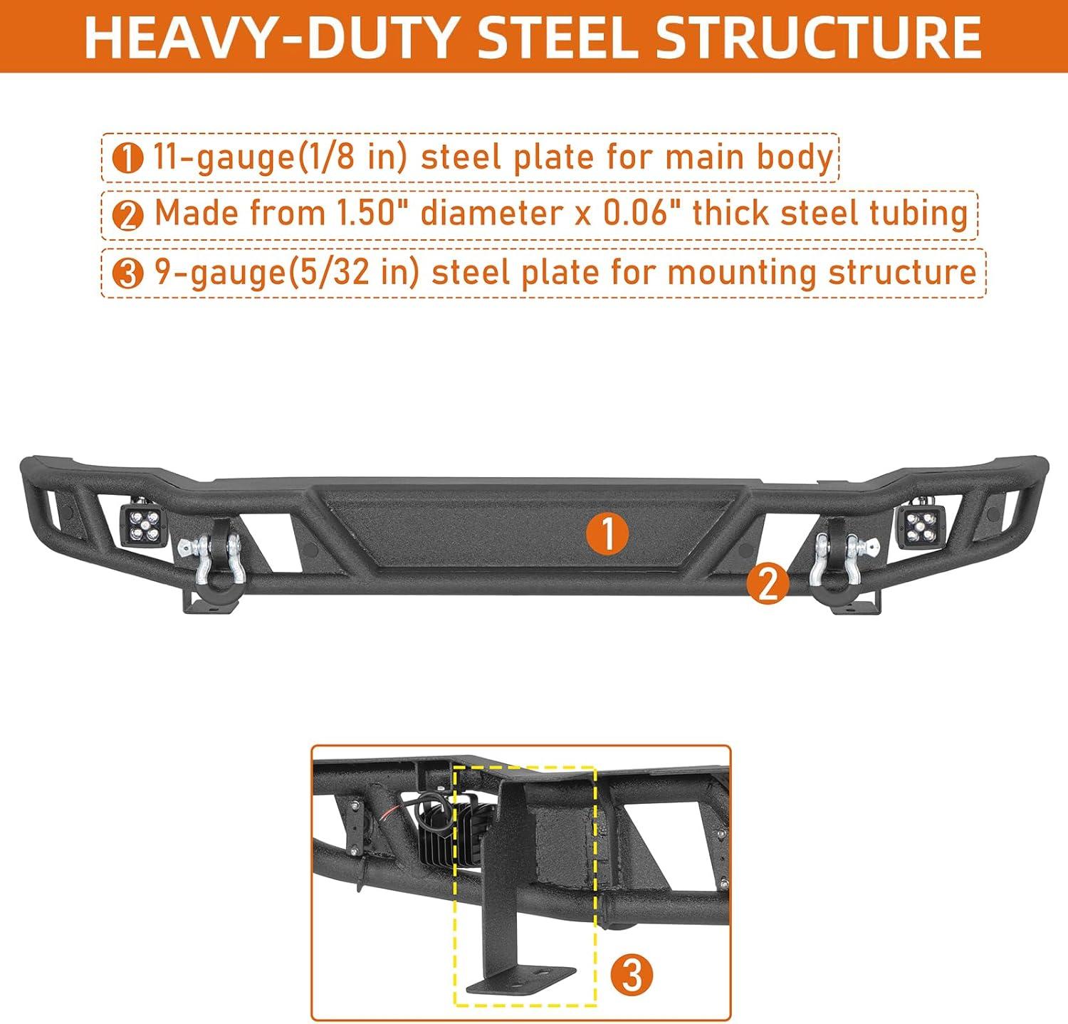 【Heavy-Duty Construction】- Made from 1.50″ diameter x 0.06″ thick steel tubing, 11-gauge(1/8 inch) steel plate for bumper main body and 9-gauge(5/32 inch) steel plate for mounting structure—while maintaining a manageable weight of 49 lbs, with minimal impact on the vehicle's performance