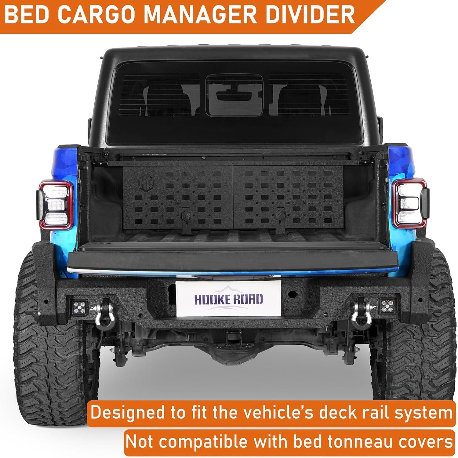 【Application】- Truck bed cargo manager divider fits for 2020-2026 Jeep Gladiator JT pickup trucks, designed to work with the vehicle’s deck rail system for a precise fit and excellent upgrade. Not compatible with bed tonneau covers