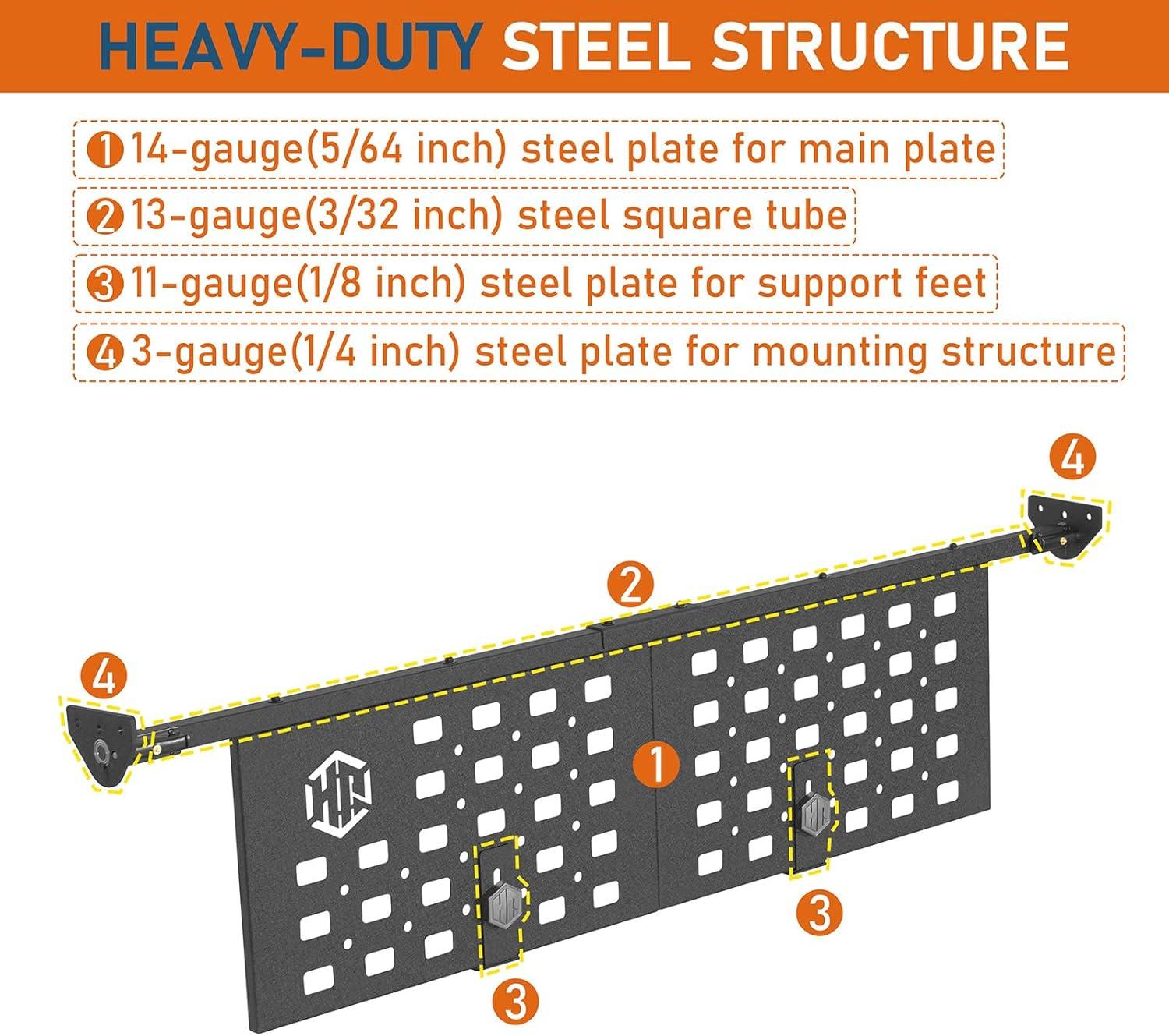 【Versatile Mounting MOLLE Plate】- Securely organizes and transports essential gear with its standardized MOLLE grid. Perfect for mounting overlanding gear like first aid kits, shovels, axes, storage pouches or tool holders, enhancing both cargo security and on-the-go accessibility