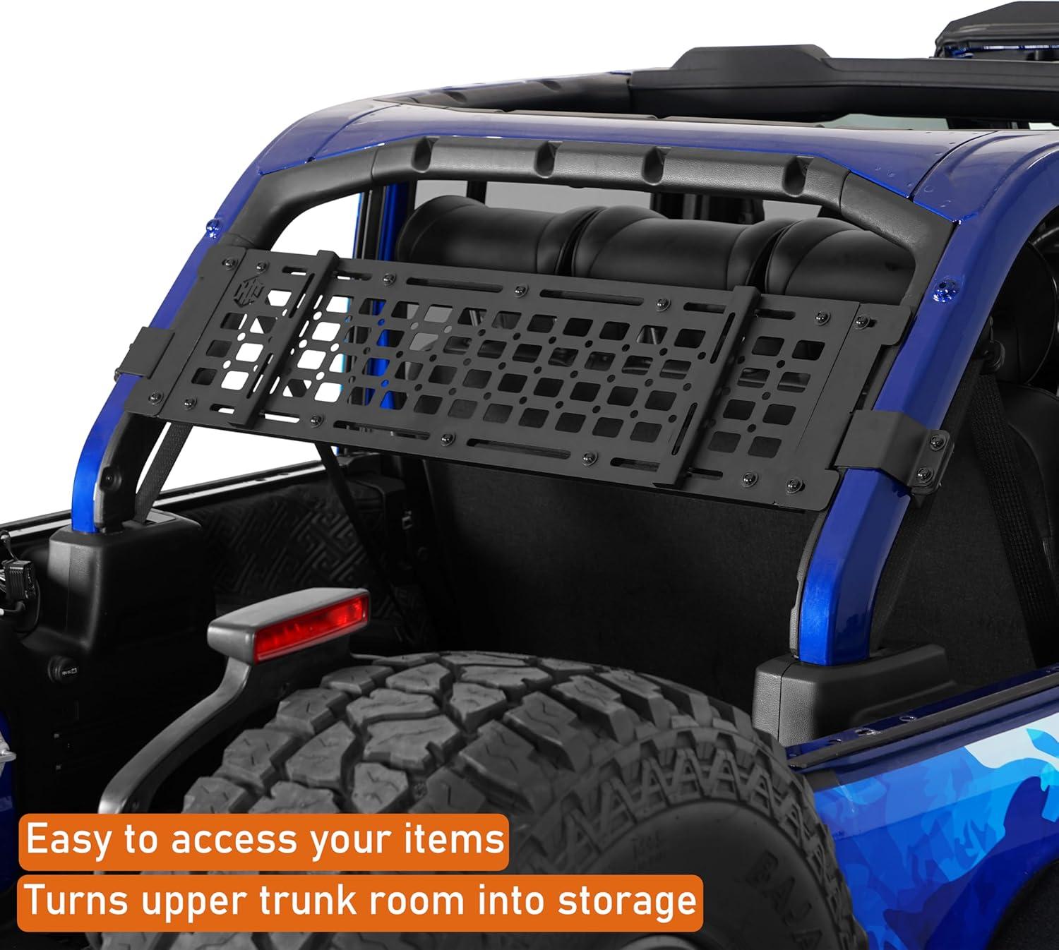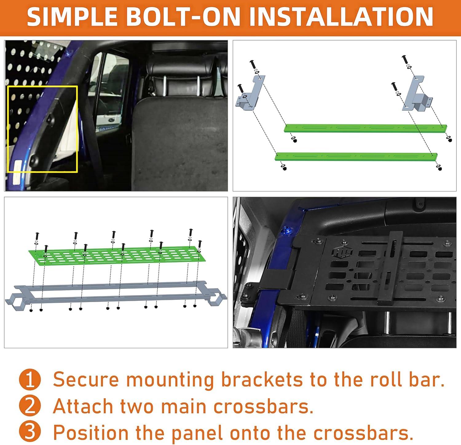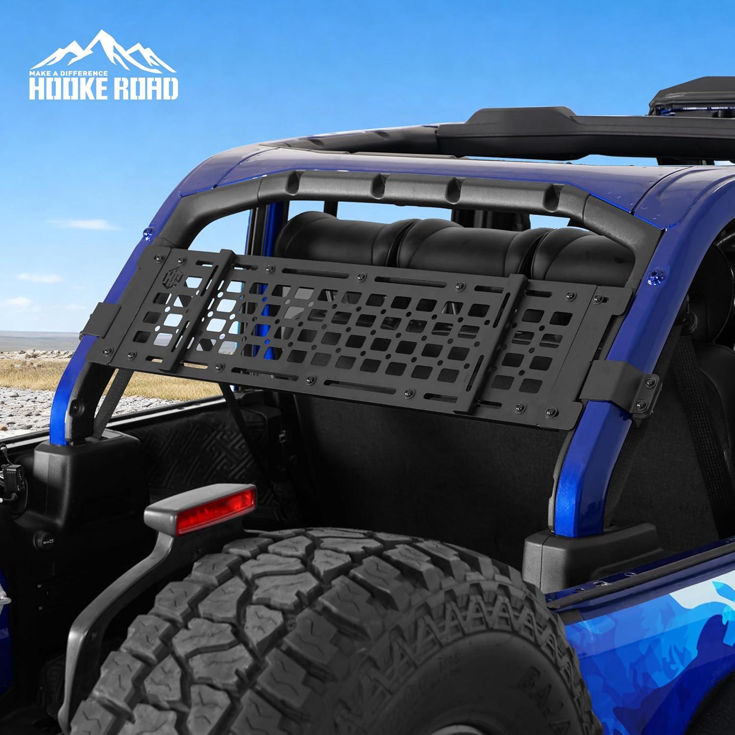 【Application】- Hooke Road roll bar storage molle panel utility rack for 2018-2026 Jeep Wrangler JL Unlimited 4-Door Hardtop. Note: After installation, the rear view mirror may be obstructed from inside the vehicle. Please carefully consider this before making your purchase