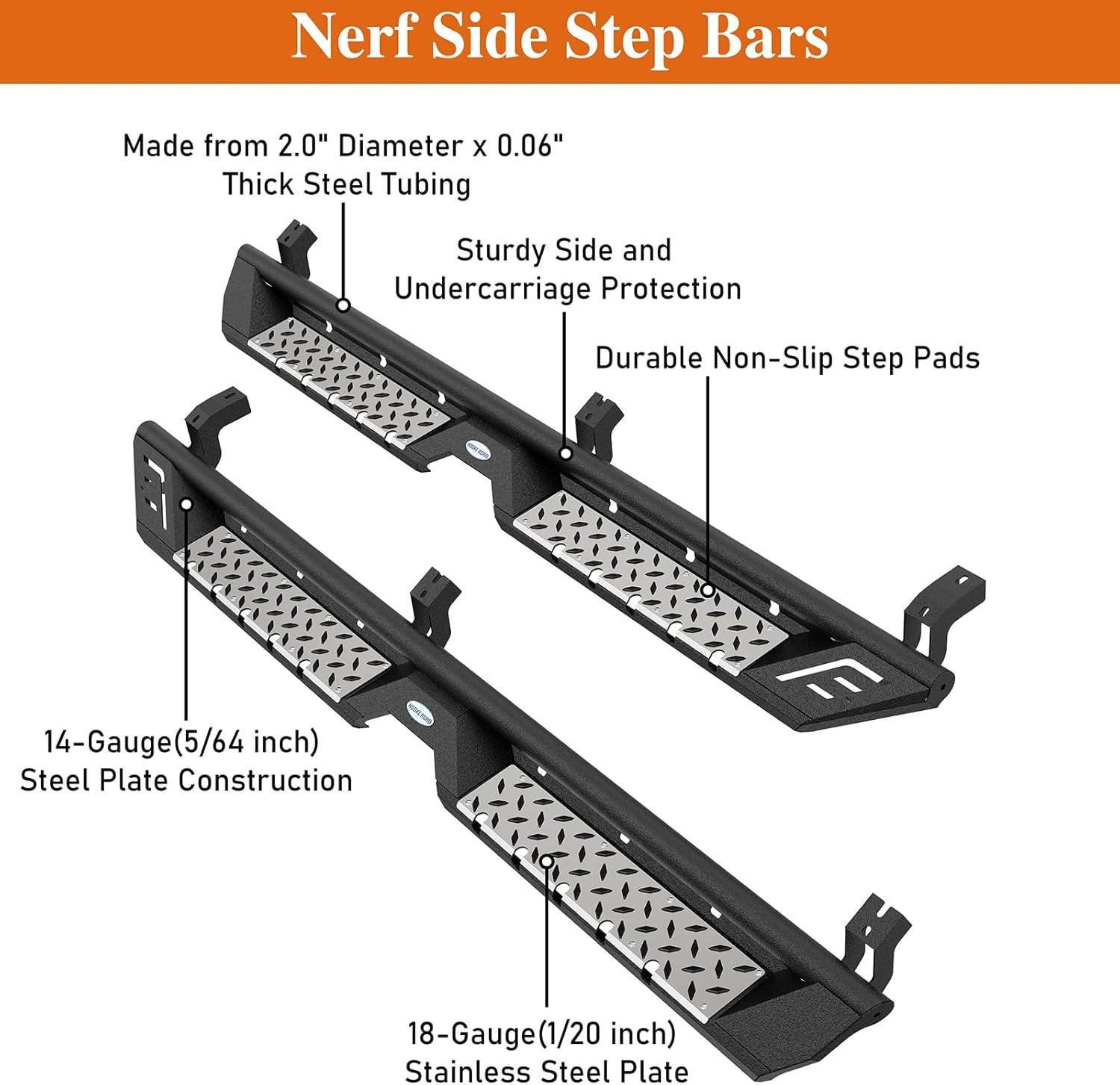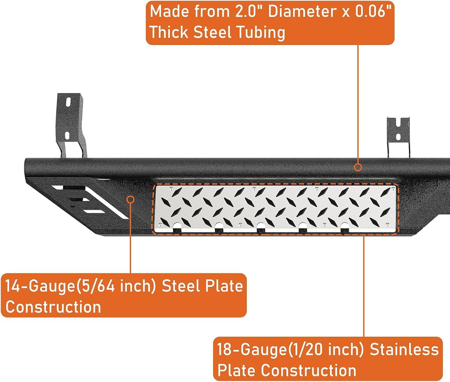 【Stable Structure】They are crafted from heavy-duty materials, including 2.0″ diameter x 0.06″ thick steel tubing, 14-gauge(5/64 inch) steel plate construction and 18-gauge(1/20 inch) stainless steel plate construction, making them durable for off-road use