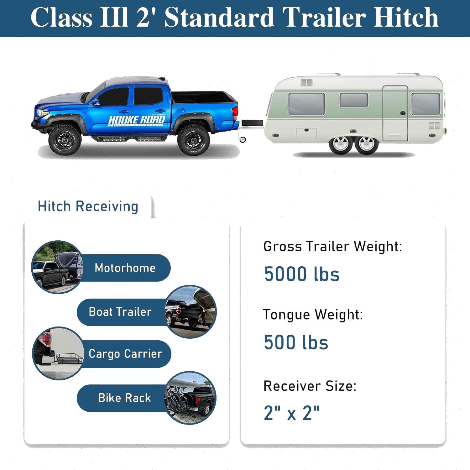 【Compatibility】Hooke Road Class III trailer hitch is compatible with 2005–2015 Toyota Tacoma models (excluding X-Runner). Not compatible with factory rear bumper. Works with Hooke Road rear bumpers that support a hitch receiver