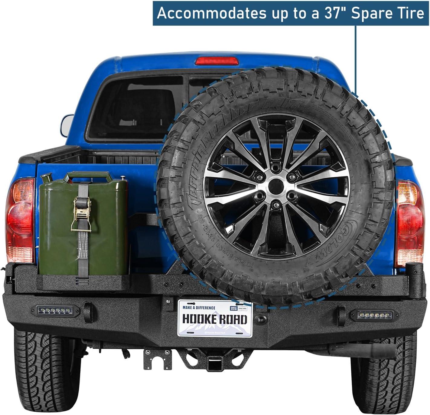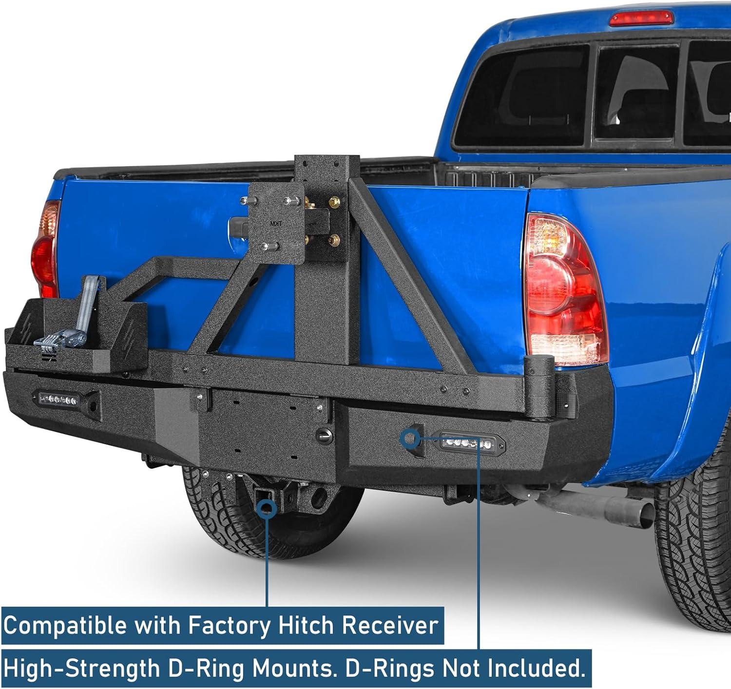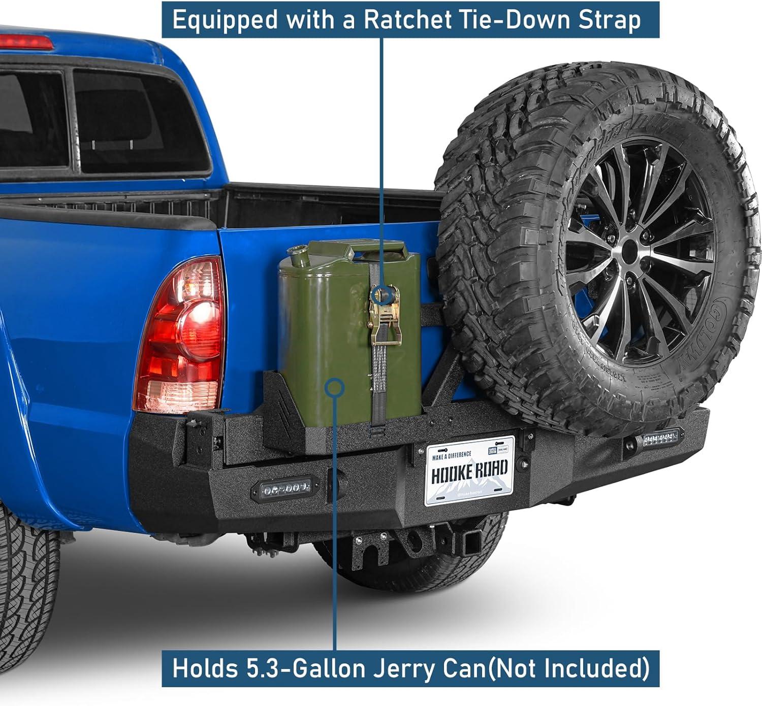 【Application】Hooke Road Explorer rear bumper with swing-out tire carrier fits 2005-2015 Toyota Tacoma 2nd pickup trucks. Compatible with factory hitch receiver. Not compatible with factory backup sensors