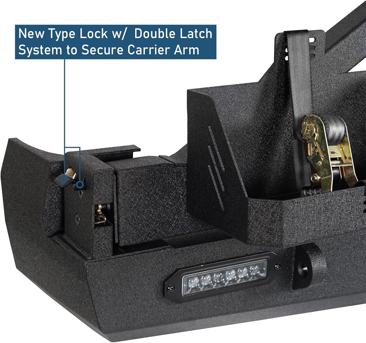 【Swing Out Tire Carrier】Equipped with a new-style lock featuring a double-latch system to securely hold the carrier arm in place. Designed to accommodate spare tires up to 37″. Features a ratchet tie-down strap for securing a 5.3-gallon Jerry Can (not included)