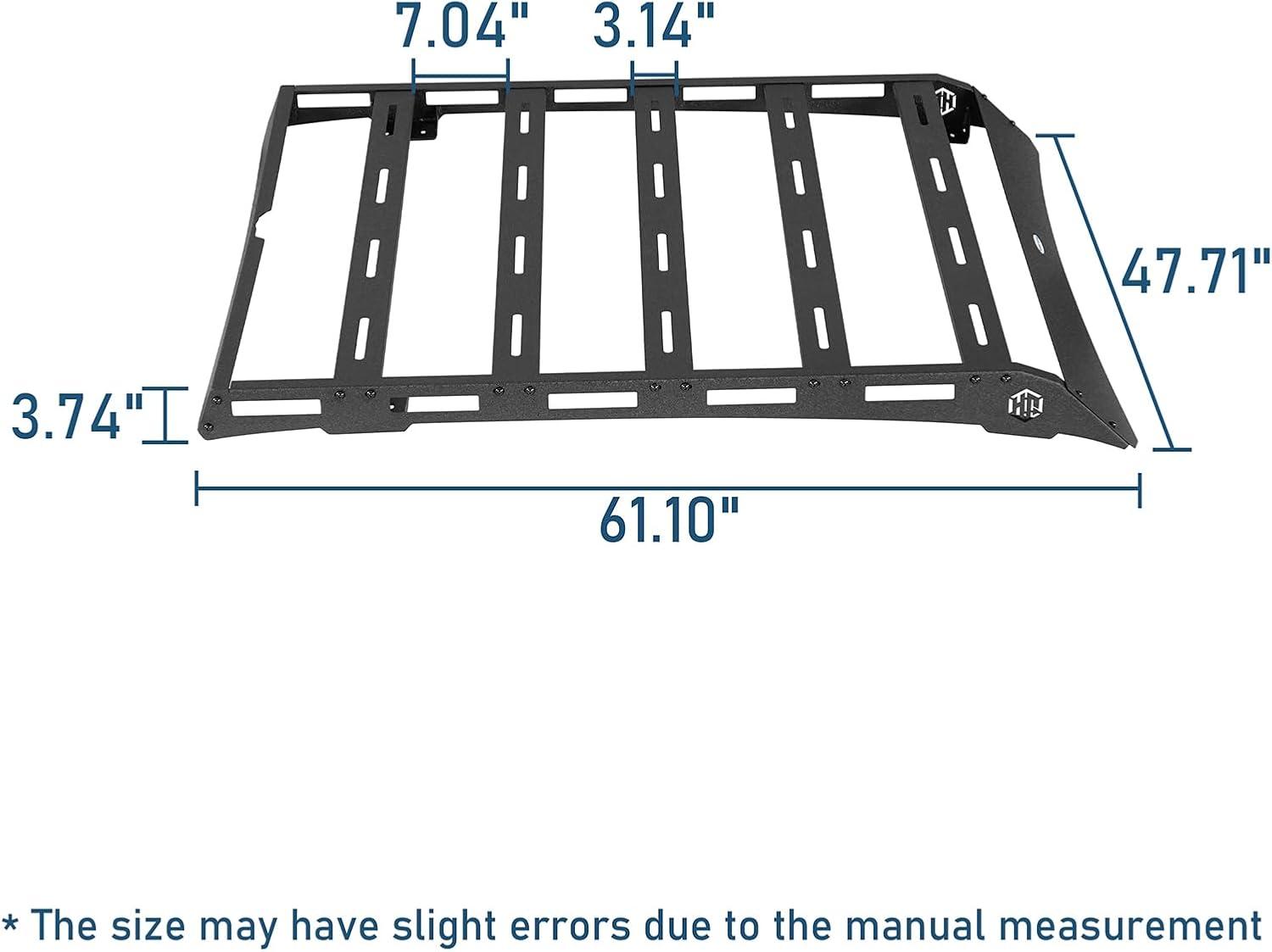 Dimension: about 47.7 in wide and 61.1 in long. Add around 3.4″ to the height of your vehicle. Product weight: about 50 lbs
