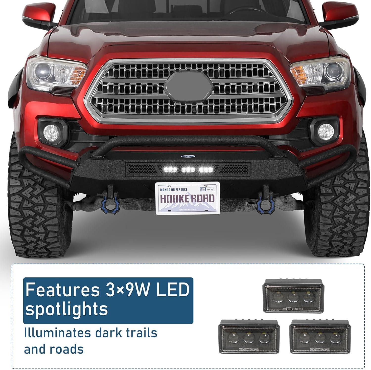 Hooke Road Tacoma Stubby Front Bumper with 3×9W LED Spotlights for 2016-2023 Toyota Tacoma 3rd Gen, Tube Offroad Bumper Bull Bar with D-ring Mounts & Low-profile Grille Guard