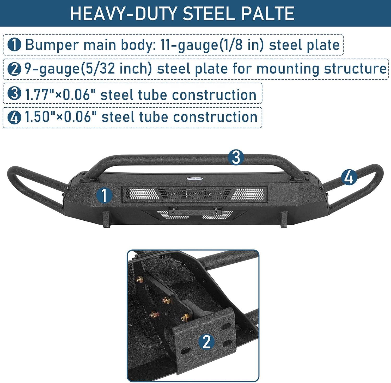 【Heavy-Duty Steel Build】- Built with 11-gauge (1/8-inch) steel main body, 1.77″×0.06″ and 1.50″×0.06″ steel tube guards, and 9-gauge (5/32-inch) steel mounting structure—durably engineered for wear and impacts. Bumper weighs about 55 lbs