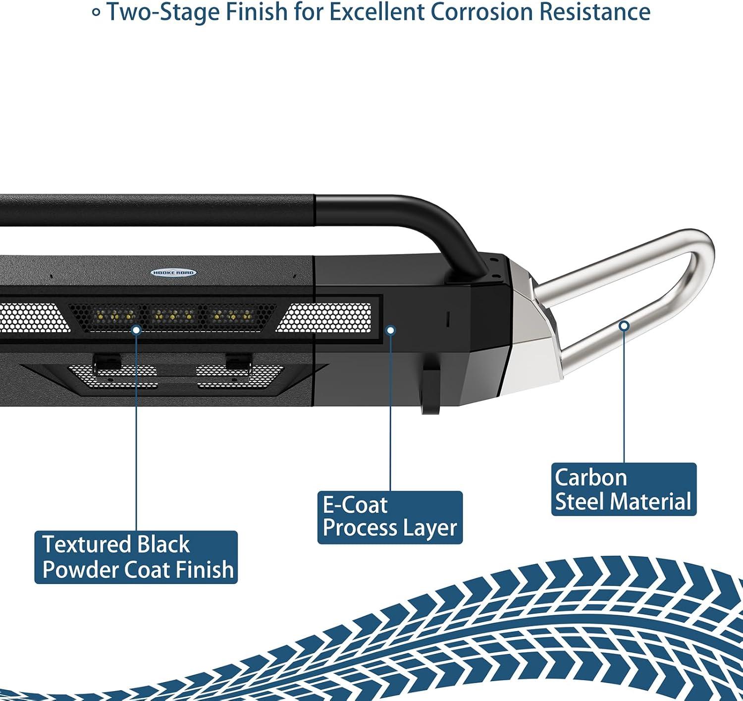 【All-Weather Durability】- Textured black powder coat and premium E-coating provide long-term corrosion protection against rain, road salt, and trail dust—ensuring the bumper maintains its rugged appearance through years of daily driving and off-road use